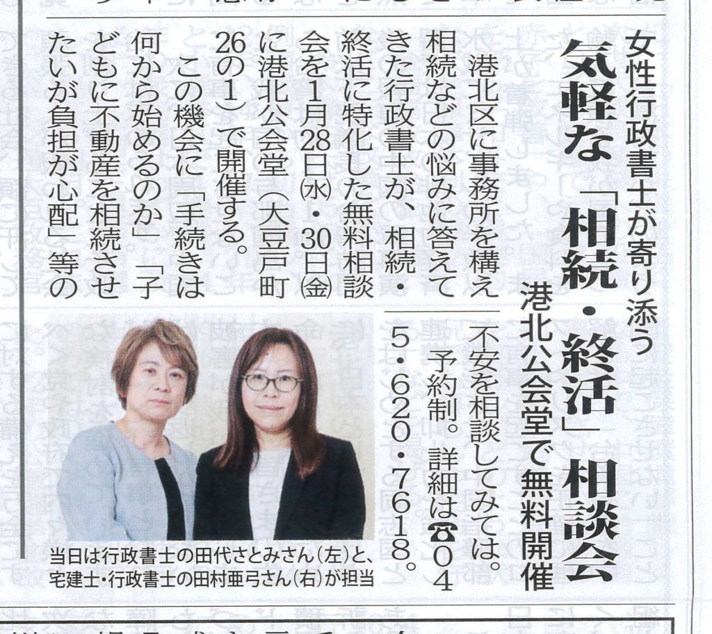 1月22日(木)発行のタウン誌「タウンニュース【港北区版】」に無料相談会の案内が掲載されました。